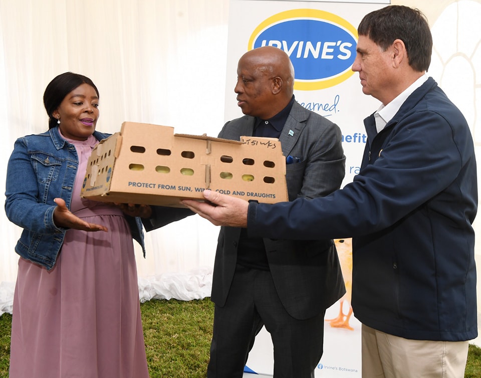 The donation to the ten farmers was a result of the 200 day old chicks that President Dr Masisi received last year at the official opening of Irvine’s Feed Mill, popularly known as Irvine’s, for onward donation to ten beneficiaries.