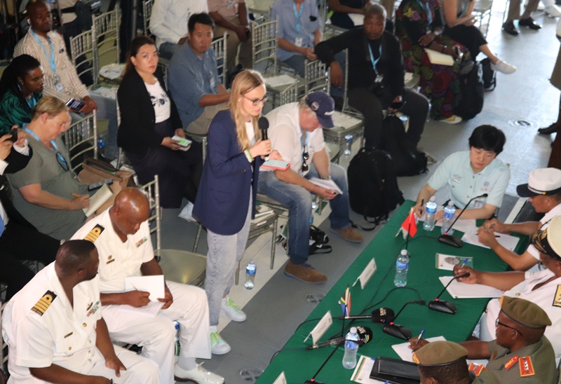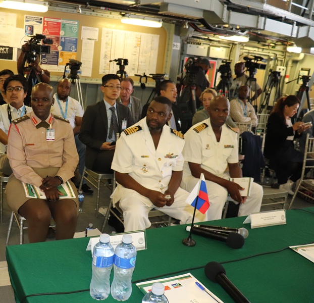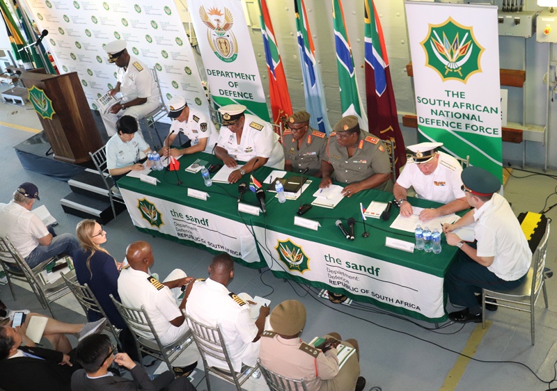 After the opening ceremony, a Media Briefing was held on board SAS MENDI. Chief Joint Operations, Lieutenant General S.L. Sangweni, officiated the media briefing. The panel for the media briefing consisted of the Chief of Joint Operations, the Chief of Staff Joint Operations Division, and Rear Admiral B.K. Mhlana, General Officer Commanding Joint Operational Headquarters, Major General S.G. Hlongwa, Captain (Navy) O. Gladkiy Russia Federal Navy, Ship Detachment Commander, Senior Captain (Navy) Sun Honglin, Commander of ETG 123. Flag Officer Fleet and Rear Admiral M. Nkomonde welcomed members of the media and introduced the panel.